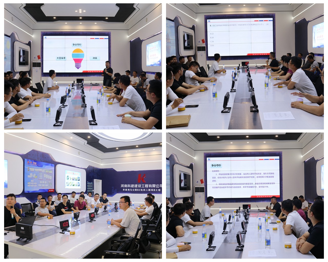 本次活动为个人赛,分为安全组和施工组。“安全知识竞答”活动共有各显身手、争分夺秒、决战等三个环节。竞答活动中各参赛选手积极抢答,通过各显身手、争分夺秒两个环节下来,各小组参赛选手之间成绩已拉开距离,但小组前几名成绩不分上下;进入决战环节,决战环节考验是选手的知识掌握熟练程度和现场竞答反应能力,通过两轮决战,最终海马B2二期项目何涛、经开区人才公寓项目刘帅获得本次活动一等奖、朝凤路二小项目马丽平、海马B2二期项目张子贵、二砂安置区项目汪梦阳获得本次活动二等奖、二砂安置区项目王生威、锦艺四季城Q地块陈文林、恒大林溪苑壹号院周晓博、恒大刁沟安置区朱玉鑫获得本次活动三等奖。